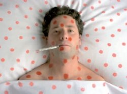 Vyrážky sa objavujú na trupe tela, na tvári a vo vlasovej časti hlavy vo vlnách, takže niektorá časť tela sa už môže hojiť, kým na inej časti práve vyrazili nové vyrážky. Intenzita a hustota vyrážok je rôzna, avšak postihnuté miesta svrbia.