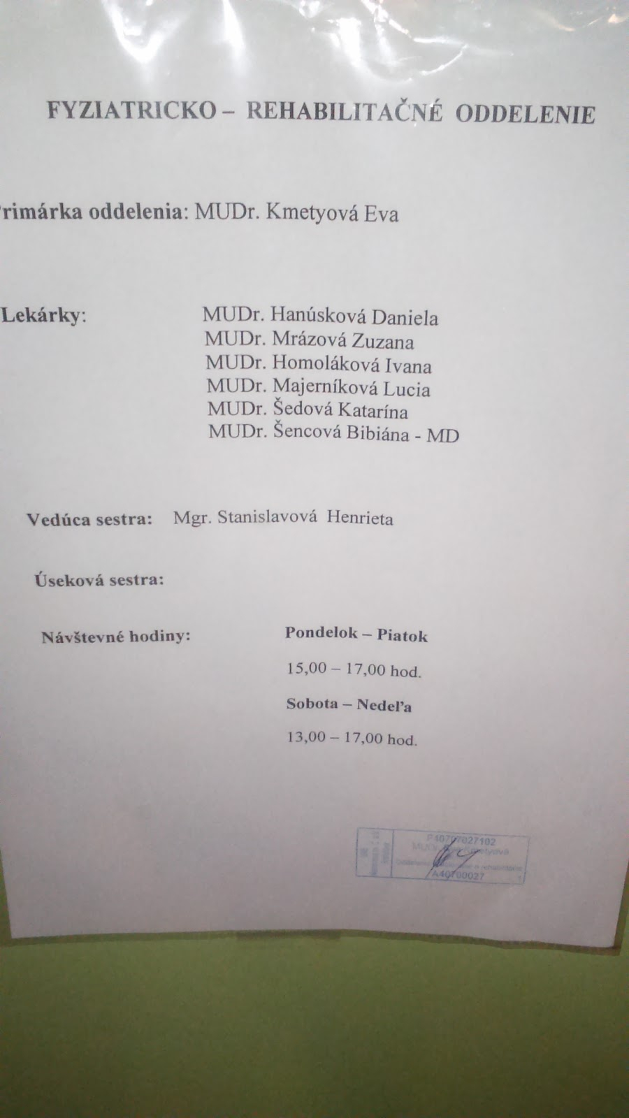 Informácie o rehabilitačnej liečbe poskytujeme na č. dv. 66 (alebo pri pulte - úsek vodoliečby).