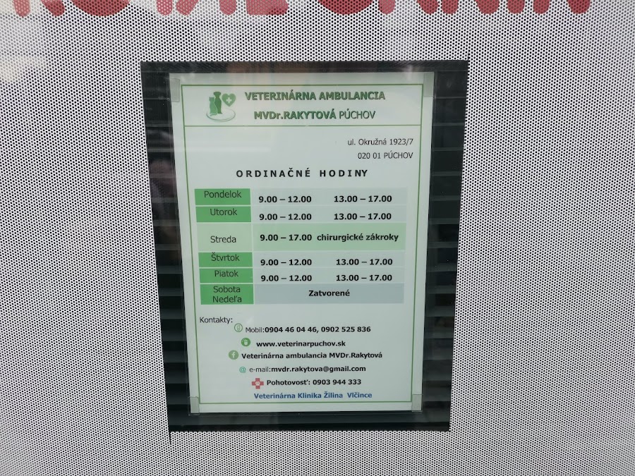 Vakcinácie-psy,mačky,králiky,fretky, klinické vyšetrenia, odčervenie šteniat, zavedenie mikročipu, vydávanie pasu, evidencia, sterilizácie - fenky, mačky, kastrácie - pes, kocúr, operácie - oko, pruh, vlčie drápy, USG -odstraňovanie zubného kameňa, predaj veterinárnych preparátov, predaj veterinárnych diét.